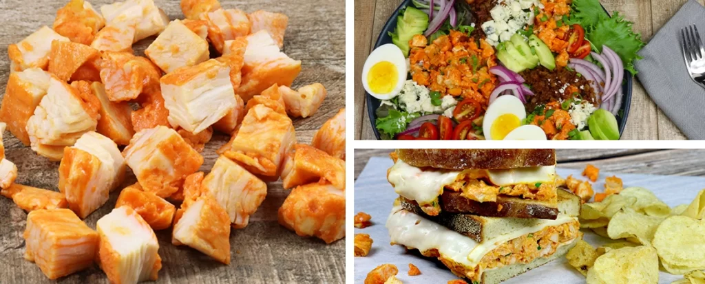 Add bold flavor to your menu with Buffalo-Style Diced Chicken Breast. Seasoned with aged cayenne, tangy vinegar, and spices, this fully cooked chicken is easy-to-prepare and the preferred choice for pizzas, salads, or sandwiches.