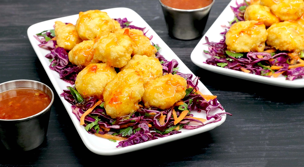 In addition to the toppings and chicken items we've mentioned, there are other easy ways to add crunch to your menu. Two rising trends to explore are tempura and chili crisp. Tempura is gaining popularity due to its simple preparation and global appeal. Serve a variety of fried veggies by coating fresh produce in tempura and deep frying. Or offer tempura boneless wings over Asian-style slaw in this simple appetizer recipe. As for chili crisp, it's one of the fastest rising ingredient trends in the US right now, with a 1,274% increase in menu mentions over the past four years, per Datassential's menu research. It's a fun addition to all kinds of savory or sweet dishes, and one of our favorites is chili crisp-garnished chicken wings like in these Flamin' Hot Honey Crunch Wings.